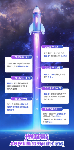 光峰科技对这一趋势有着准确把握。其AR光机产品在短短四个月内完成迭代,从2025年9月推出蜻蜓G1,到2026年1月升级至蜻蜓C1,光峰科技在AR光机领域进入技术爆发期◇-●。这种进步,离不开企业多年的技术沉淀。