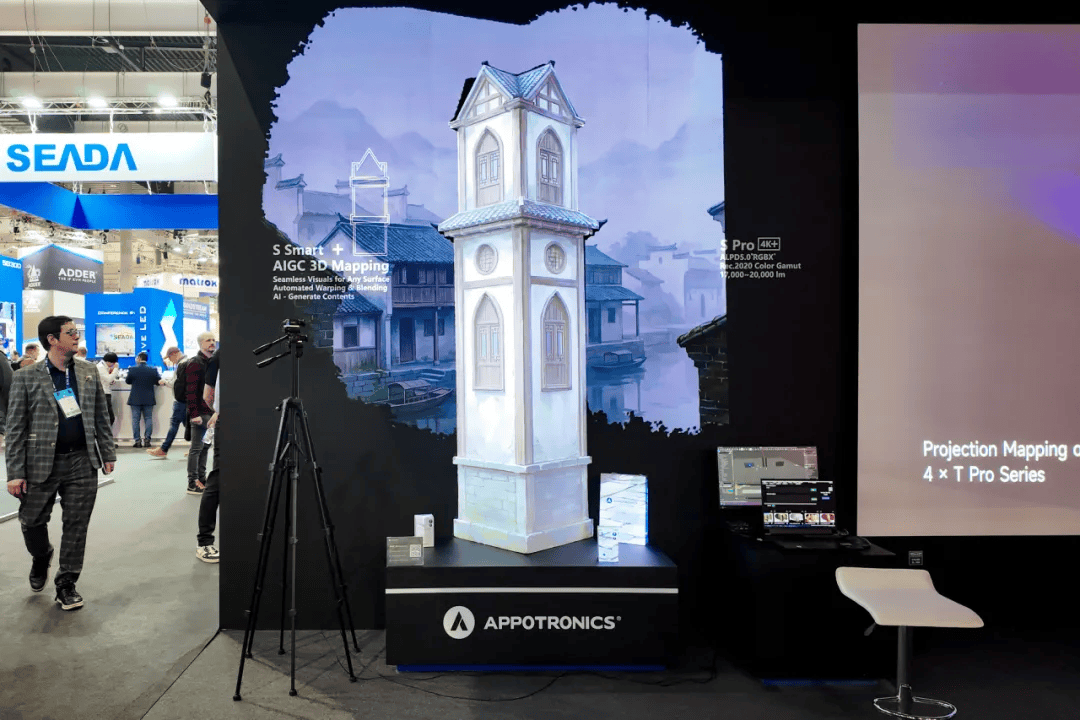 其中,S Smart依托算法实时生成画面并完成精准适配,将内容清晰投射于现场钟楼建筑模型,打造出高品质的3D Mapping投影秀。